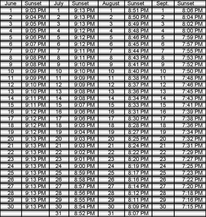 the summer. Approximate timing for sundown in SE Michigan is noted as follows.